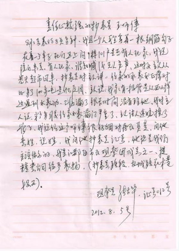 2012年8月5日,自來水公司收到一封來自江都市民觀察團成員的表揚信,信上寫著王梅富同志在一次日常工作中,發現有一用戶家中無人居住,嚴重漏水的問題,前后幾次往返鄰居和物業之間登記檢查,直至聯系上用戶,并確認用戶已將水表閥門關緊,不再漏水,才放心離開。事后王梅富同志只是說,這是他工作中很平常的一件小事,是自己應盡的工作職責。